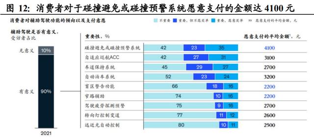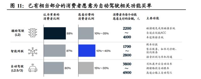 消费者对辅助驾驶、自动驾驶功能的付费意愿较强,相关模块渗透率有 望快速提升。罗兰贝格的调研结果显示,认为辅助驾驶(L2)与自动驾 驶(L2.5/3)功能重要的消费者比例已经分别高达 88%与 80%,其中对 于 L2 中单个功能愿意支付的费用为 2200-4100 元,对 L2.5/3 中单个功 能愿意支付的费用则高达 3800-4900 元。消费者较强的付费意愿有望带 动智能驾驶相关模块渗透率快速上升。