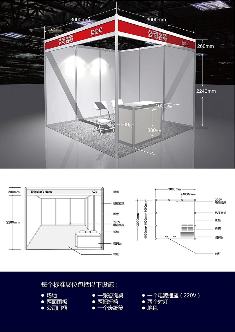 ※标准展位 :展出场地、2.5m高壁板、楣牌制作、9平方米地毯、洽谈桌一张、椅子二把、10A/220V单相插座一个,射灯二支。